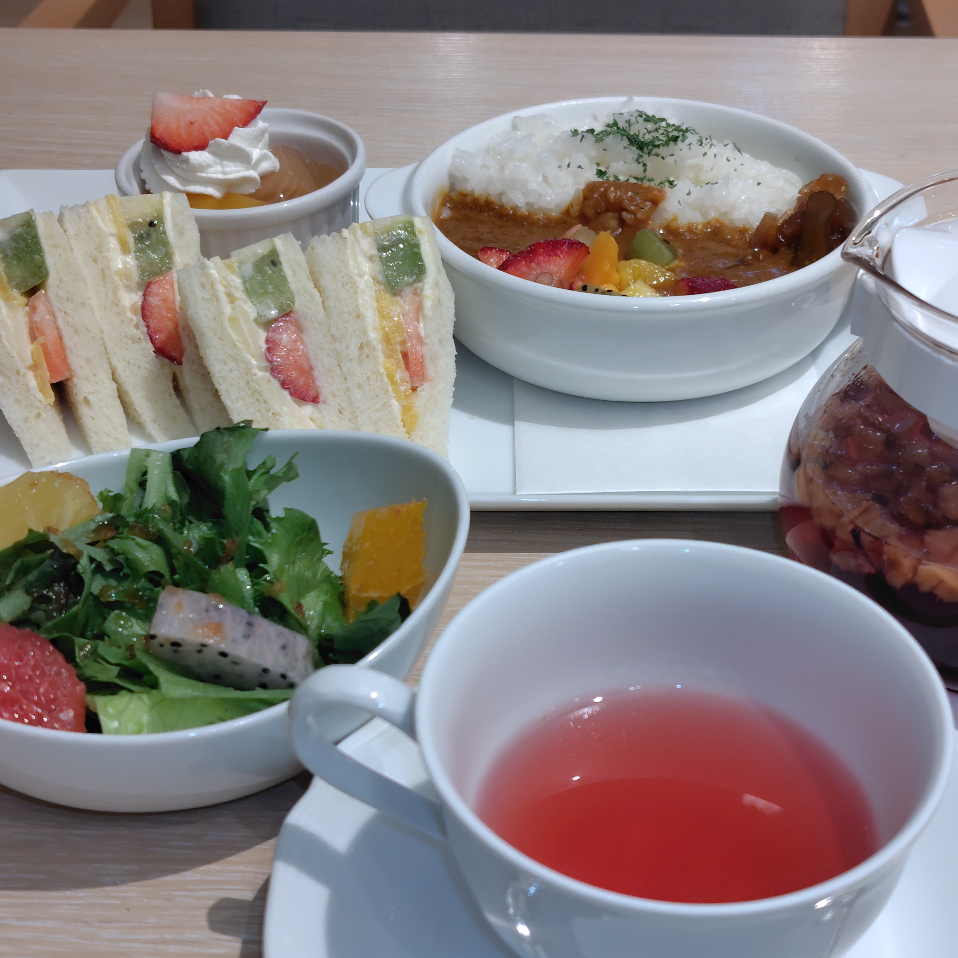 フルーツカレー➕️フルーツサンド➕️フルーツサラダ➕️フルーツゼリー➕️フルーツティのランチを一人でゆったり頂きました✨